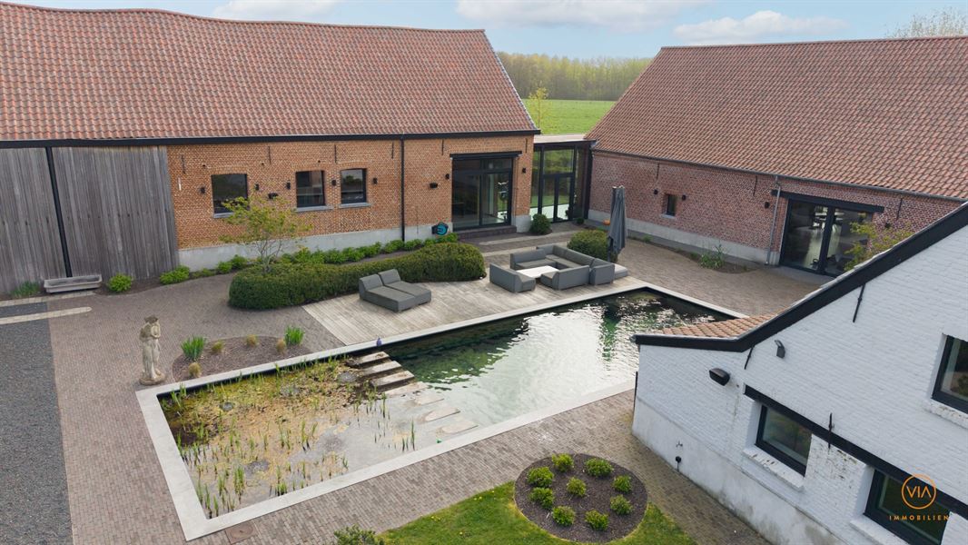 Deze voormalige hoeve met zwemvijver & bijgebouwen werd recent volledig gerenoveerd en is gelegen in een extreem rustige en landelijke woonomgeving in de befaamde "Boshoek" grens Hove Lint. Dit exclusief eigendom werd volledig vernieuwd in 2018 op ca 5800 m² grondopp. en heeft een exceptionele beleving door haar grootte, opbouw en modern comfort. Alle open leefruimtes werden georiënteerd met zicht op groen en omliggende open velden. De smaakvolle ingerichte leefruimtes creëren een gezellig en comfortabel woongevoel. De grote glaspartijen en perspectieven zijn beredeneerd naar extensie binnen/buiten, maximaal lichtinval en zorgen bovendien voor een levendig gevoel van ruimtelijkheid. Deze openheid komt terug doorheen de ganse woning. De totale woonopp. bedraagt zon 400m². U betreedt de woning middels de centrale inkomhal met vide en toegang tot een zeer ruime living voorzien vloerverwarming, aansluitend de gezellige leefruimte en tevens een prachtige leefkeuken welke eveneens in direct contact staat met tuin en terras. Achteraan treffen we de masterbedroom met dressing en eigen badkamer. De nachthal boven brengt u tot drie extra kamers welke een badkamer delen. Een groot kantoor met opslagruimte, stallen en een polyvalente woning vervolledigen het plaatje. Dit alles maakt van dit landgoed wellicht één van de meest exclusieve eigendommen in de regio. Dit kan aldus een mooie opportuniteit zijn voor mensen die op zoek zijn naar een instapklare en exclusieve villa met veel leefruimte, die bovendien uiterst landelijk en rustig gelegen is. Hoogwaardig comfort met een laag energieverbruik.